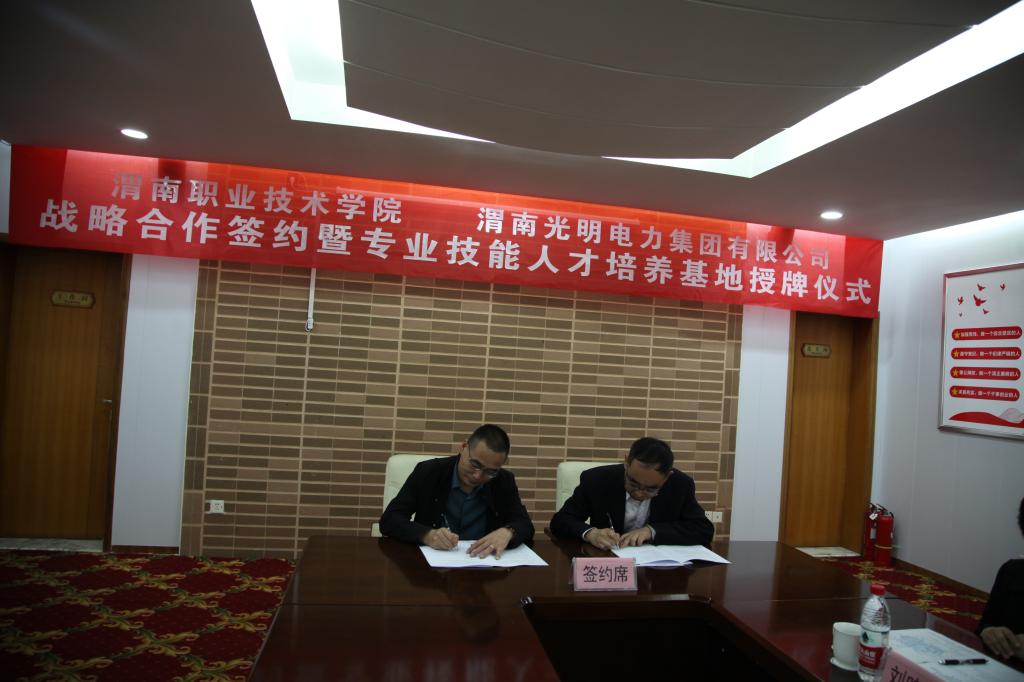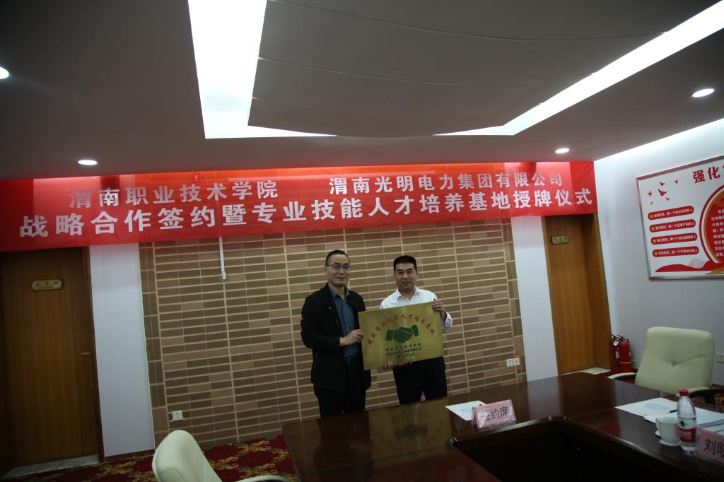 5月25日上午,十大买球的正规网站与渭南光明电力集团有限公司战略合作签约暨专业技能人才培养基地授牌仪式在华阴市莲花山庄举行。渭南光明电力集团有限公司主管领导徐斌副总经理,光明电力集团有限公司董事长郭峰及相关部门负责人,十大买球的正规网站党委副书记党少平,副院长王韦华,十大买球的正规网站院长孙志强,建筑工程教研室副主任王宁宁等教师代表出席了本次活动。
