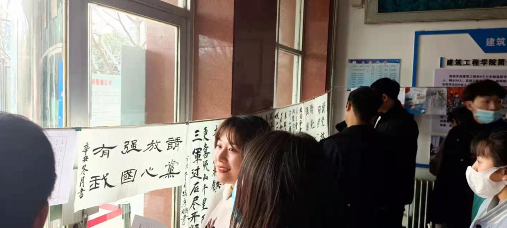 所有的参赛作品均在建工楼二楼大厅展出,经过师生评委的打分评比,姚斌同学凭借深厚的书法功底获得一等奖,郭福田和员世博同学以其刚劲有力的硬笔书法获得二等奖,韩宁宁、赵琪与苏凡三位同学凭借高超绘画能力获得三等奖。