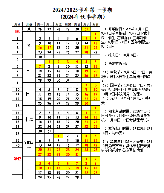 2024年秋季学期校历