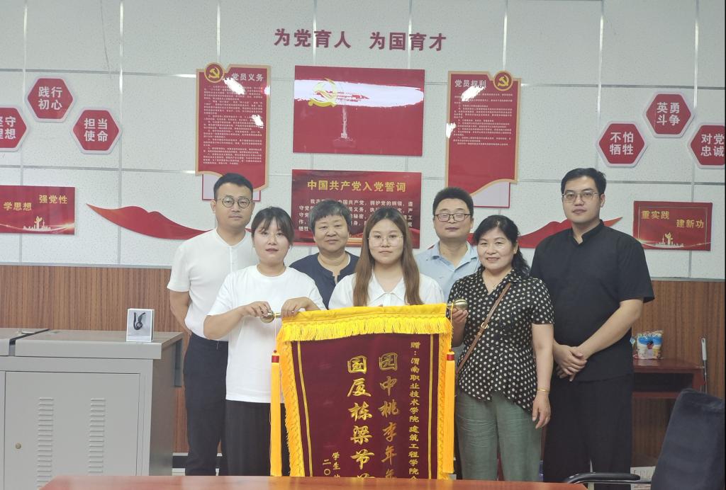 周晓燕书记对饶佳曼同学赠送锦旗表示感谢,希望她能永怀初心,继续努力,做出一番成绩,以后能常回学院看看。