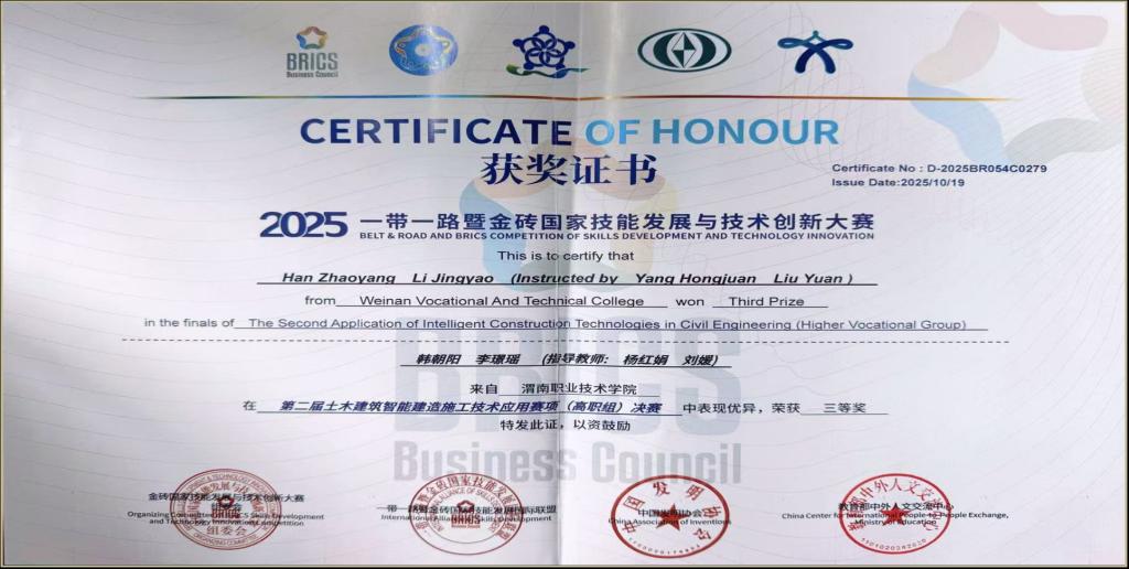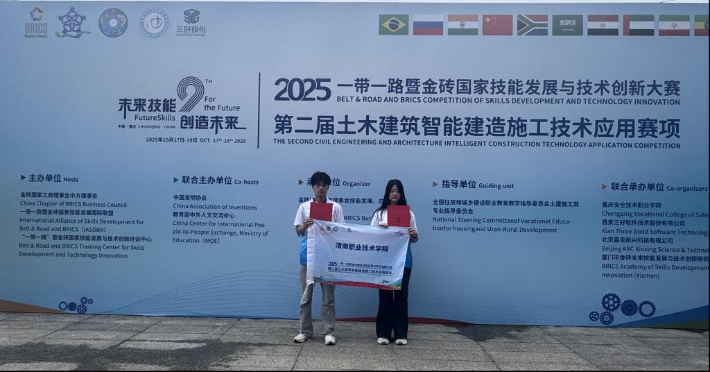 10月17日至19日,2025“一带一路”暨金砖国家技能发展与技术创新大赛之第二届土木建筑智能建造施工技术应用赛项决赛,在重庆安全技术职业学院落下帷幕。来自全国800余所院校、近6000名师生参与选拔,覆盖范围从传统土木强校延伸至新兴开设智能建造专业的院校,最终角逐出298支队伍入围决赛。十大买球官网韩朝阳、李璟瑶同学凭借扎实的专业知识和出色的实践能力,在激烈竞争中脱颖而出,荣获全国三等奖。