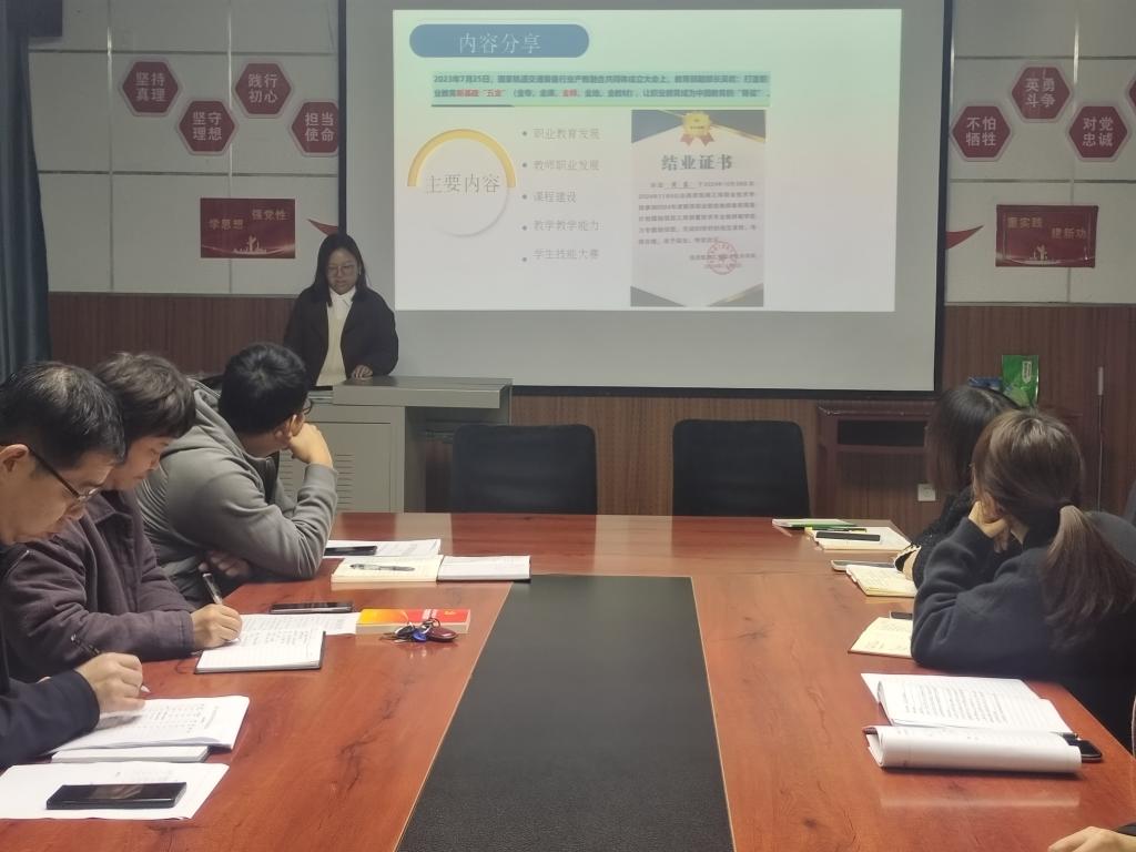 随后进行了党员教师2024年国培学习交流研讨,孙华东、黄蓉两位同志结合自己的国培经历和收获进行了经验分享。孙华东同志从培训基本情况、整体感悟和专业建设三方面进行分享交流。黄蓉同志从职业教育发展、教师职业发展、课程建设、教师教学能力和学生技能大赛共五个方面进行了分享交流。