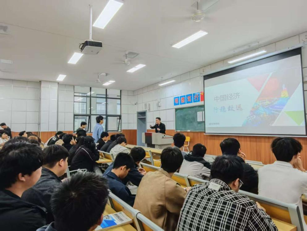 课堂上,张国栋从《时事报告》中的中国经济章节引入讲授内容。他采用“理论讲授 + 情景模拟 + 互动问答” 的授课形式,紧密围绕国内外经济形势新变化,引导大家深入思考和领悟习近平经济思想的科学内涵与实践要求,坚定走中国特色社会主义经济发展道路的信心与决心,鼓励青年学子要立足专业知识,培养全球视野,积极投身于国家经济建设与对外开放的伟大事业中。整个课堂气氛活跃,师生互动热烈,充分展现了学生们的学习热情和主讲人教学智慧。